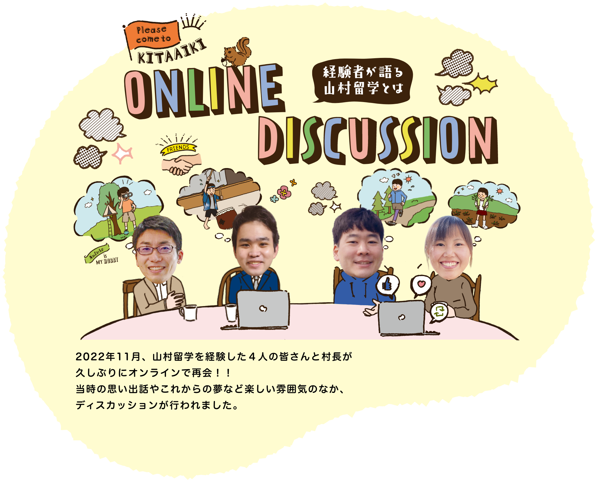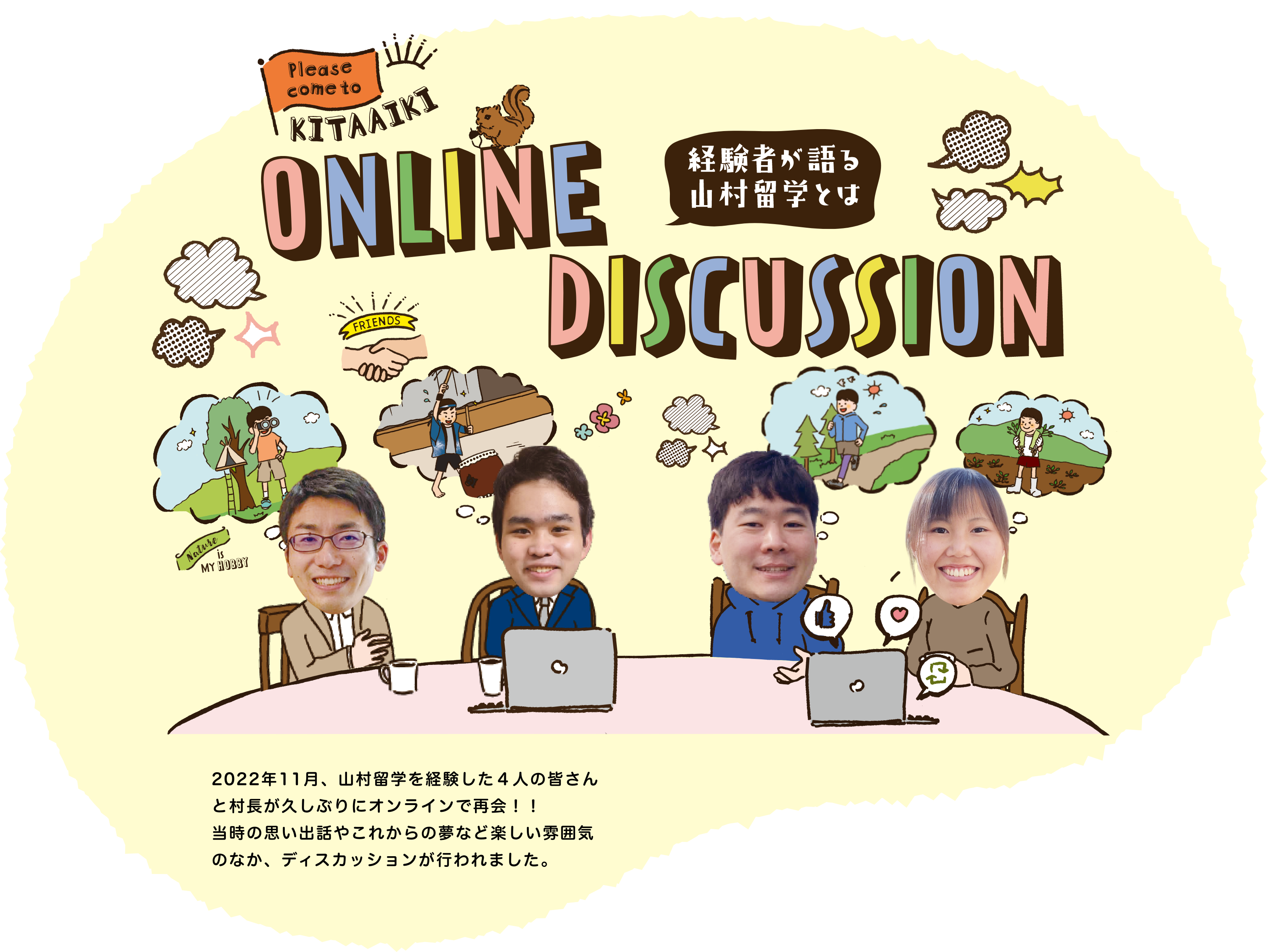 山村留学を経験した4人の皆さんと村長が久しぶりにオンラインで再会!!