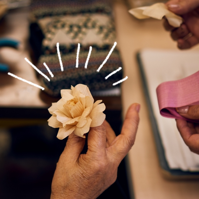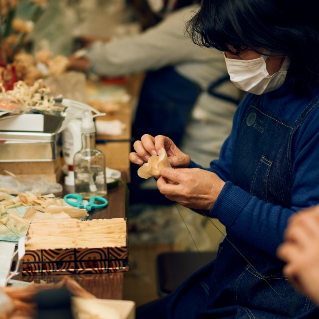 2016年、現在の地域林政アドバイザー坂本さんから「木工所で出るかんなくずの活用法を考えたい」という相談を受けたことからキノハナ作りが始まりました。製作に携わったことがなかったため、いろいろ調べ、試行錯誤をしながら始めました。今は週に2回、10人程度で活動しています。