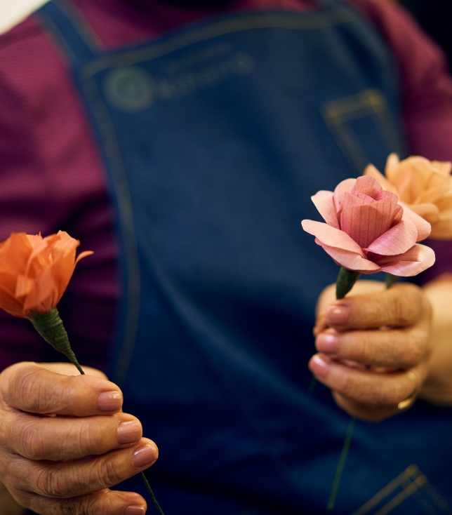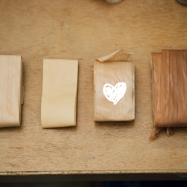 最初はとにかく作ってみようと、木のバラとカーネーションづくりから始まりました。花が形になってきた2018年に「キノハナkinano」の団体を立ち上げ、翌年から色をつけることにも挑戦しました。色も自然のものを使おうと「色がついている花や野菜・果物などを片っ端から煮てみる」という実験のようなことをして、使えるものを探し着色をしています。かんなくずもカラマツをはじめ、たくさんの木々を使います。それぞれ固さも色のつき方も違うので、木の個性を生かした花をつくっています。